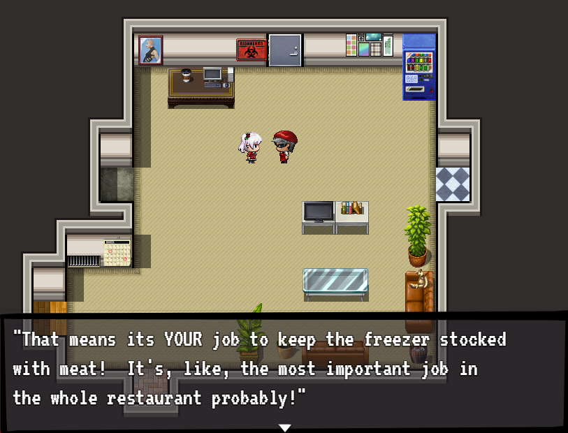 Like I said, it’s a roguelite! You play as Niko, the new hire at a remote burger establishment named Burger Site, and it's your job to keep the freezers stocked with meat for the hungry customers to munch on. How do you do that? Simple! Just head down to the horrible sprawling flesh-dungeon underneath the building and blast a few of the roaming monsters into delicious meaty chunks! Just make sure they don't take a bite out of you, first.
